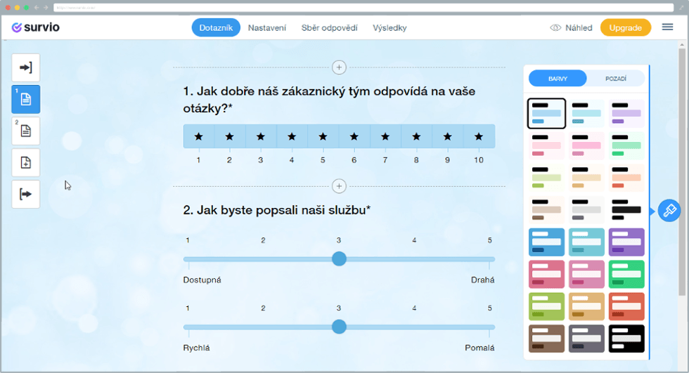 - Nový design dotazníků si nyní můžete vytvořit jednoduše sami, pomůže vám s tím velká nabídka barevných schémat a mnoho obrázků na pozadí. Můžete vytvořit stovky kombinací. Vaše dotazníky posunete na vyšší úroveň a pro respondenty bude radostí je vyplňovat.