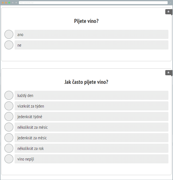 Máte pravdu. Na první otázku již odpovídá otázka druhá, protože ten, kdo nepije víno zvolí odpověď „víno nepiji“, ostatní vyberou jinou odpověď. Ušetříme tak celou otázku. V mnoha případech se dá podobným postupem dotazník zredukovat i o čtvrtinu otázek.