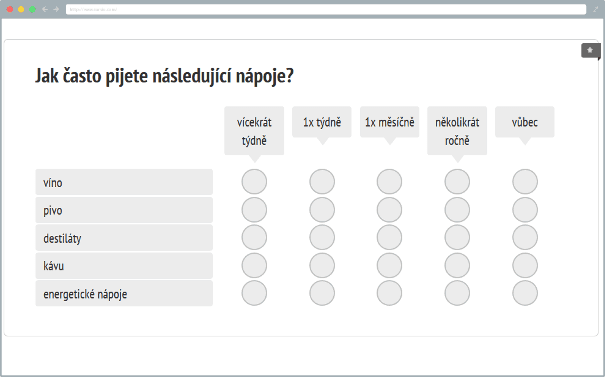 Jestliže by byla otázka složitější a místo odpovědí ano x ne by respondenti odpovídali na škále intenzity konzumace (např. vícekrát týdně, 1 týdně,  atd.), můžeme efektivně otázku spojit do tzv. bateriové otázky (často také označované jako maticová otázka). Příklad takové otázky je na následujícím obrázku. Všimněte si, že jsme ušetřili spoustu místa a respondent se nemusí soustředit pokaždé na novou otázku lišící se pouze typem nápoje. Dotazník bude mnohem rychleji vyplněný.