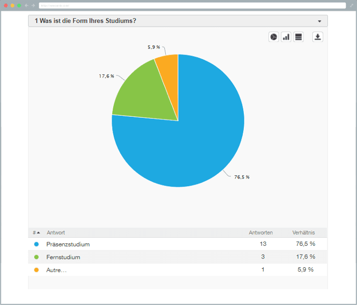 Folgender Graph enthält absoluten und auch prozentuellen Ausdruck der Verhältnisse von allen Antworten. Textantworten sind sehr schwer automatisch (mit Algorithmus) zu beurteilen. Wir empfehlen manuelle Bearbeitung dieser Texteingaben.