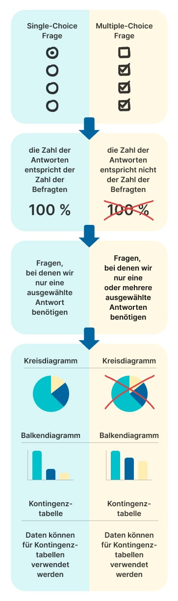 Wesentlich ist, dass bei einer Single-Choice-Frage der Befragte lediglich eine Antwort auswählen kann. Bei einer Multiple-Choice-Frage hat er mehrere Antwortmöglichkeiten.