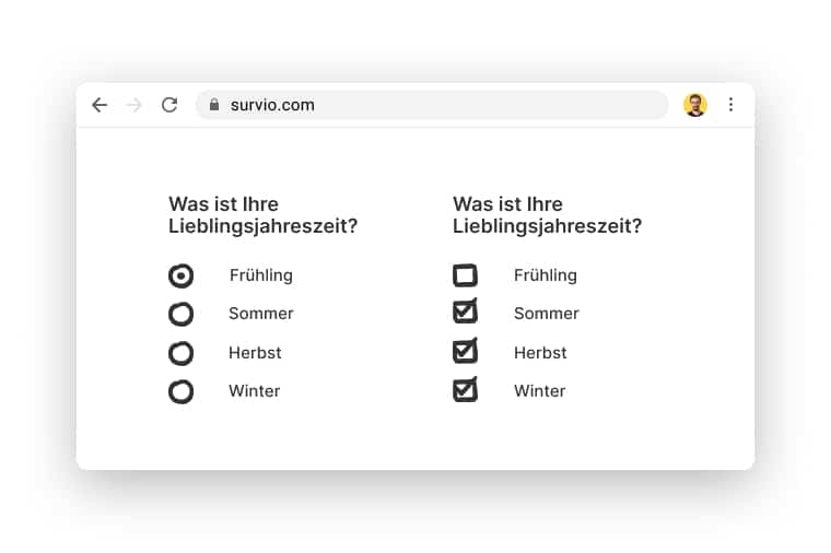 In der Abbildung sehen Sie, dass die Frage völlig identisch ist. Im ersten Fall (rechts) handelt es sich jedoch um eine Single-Choice-Frage und im zweiten Fall (links) um eine Multiple-Choice-Frage. Sie unterscheiden sich lediglich in dem Ankreuzfeld (Kreis und Kästchen).