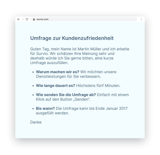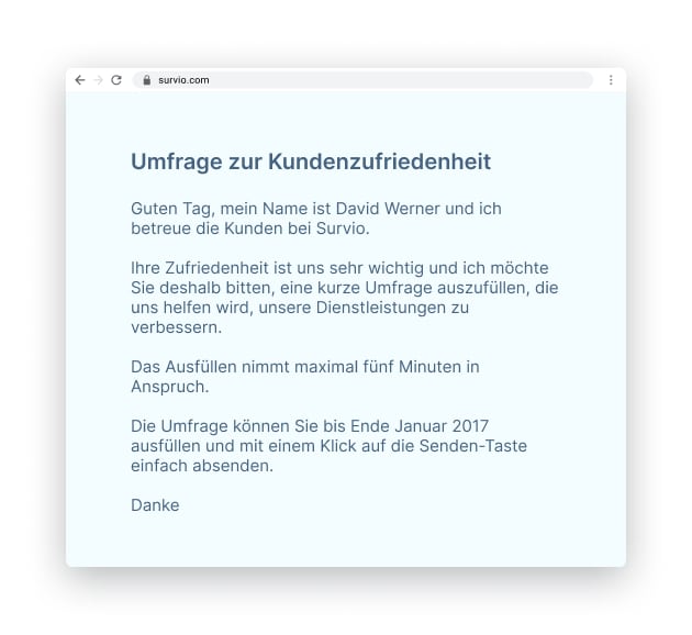 Sie sollten sich gleich im Einleitungstext vorstellen oder zumindest mit Ihrem eigenen Namen unterschreiben, damit die Befragten wissen, mit wem sie es zu tun haben.