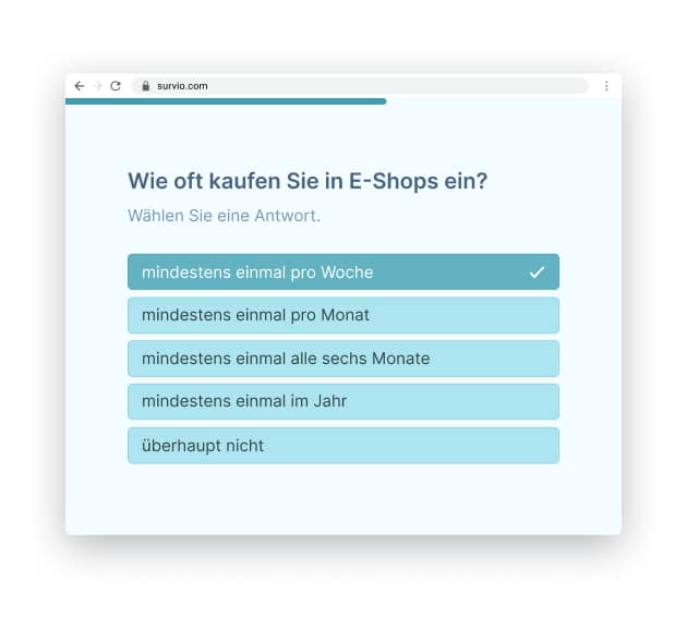 Mit der Möglichkeit, die Umfrage aufzuteilen, hängt auch die Information über den Fortschritt beim Ausfüllen zusammen. Dies ermöglicht den Befragten, eine Übersicht zu gewinnen, wie lange das Ausfüllen ungefähr noch dauern wird. Vergessen Sie nicht, was Sie in der Einleitung der Umfrage versprochen haben. Für das Ausfüllen einer Umfrage mit 20 Fragen braucht der Befragte vermutlich mehr als fünf Minuten. Ein Beispiel für die Anzeige dieses Fortschritts sehen Sie in der Abbildung (in Survio wird der Fortschritt mit einem dunklen Balken dargestellt, der sich mit jeder weiteren beantworteten Frage verlängert).