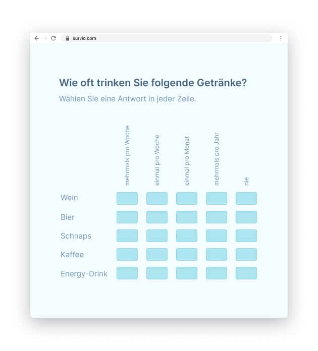 Wenn die Frage komplizierter wäre und die Befragten anstatt der ja x nein-Antwort mit Hilfe einer Skala für die Intensität des Konsumierens antworten würden (beispielsweise mehrmals pro Woche, einmal pro Woche und so weiter), können wir diese Frage effizient zu einer sogenannten Batteriefrage (oft auch als Matrixfrage bezeichnet) zusammenfassen. Ein Beispiel für so eine Frage finden Sie in der folgenden Abbildung. Sie können sehen, dass wir viel Platz eingespart haben. Und der Befragte muss sich nicht immer wieder auf eine neue Frage konzentrieren, die sich lediglich im Typ des Getränks unterscheidet. Die Umfrage wird wesentlich schneller ausgefüllt sein.