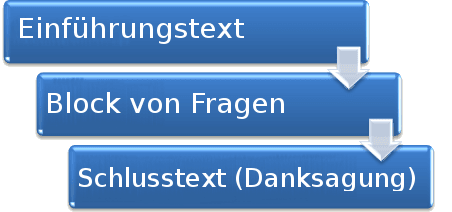 Am Anfang jedes Fragebogens empfehlen wir hochwertigen Einführungs- und Schlusstext zu bilden. Im Einführungstext des Fragebogens versucht man das Gebiet zu beschreiben, das man mit Fragebogen lösen will und was man von Befragten verlangt. Vergessen Sie nicht, auch die Zeit des Ausfüllens anzudeuten. Der Befragte stellt sich schnell vor, was ihn erwartet, und es ist dann wahrscheinlicher, dass er den ganzen Fragebogen ausfüllt.