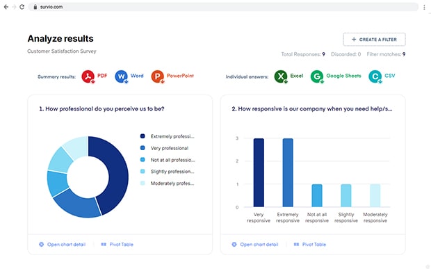 You don't have to wait to collect results from all guests. You can watch the survey unfold in real time. Survio generates the results automatically in clear tables and charts. You can filter summary results and also individual answers, change the type of chart, create pivot tables.