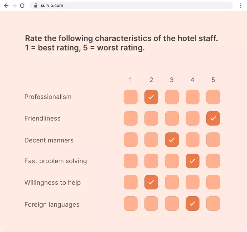 Don’t be afraid to use matrix questions. They make your survey shorter and clearer as they group more questions together. The rating scale is also called the Likert scale.