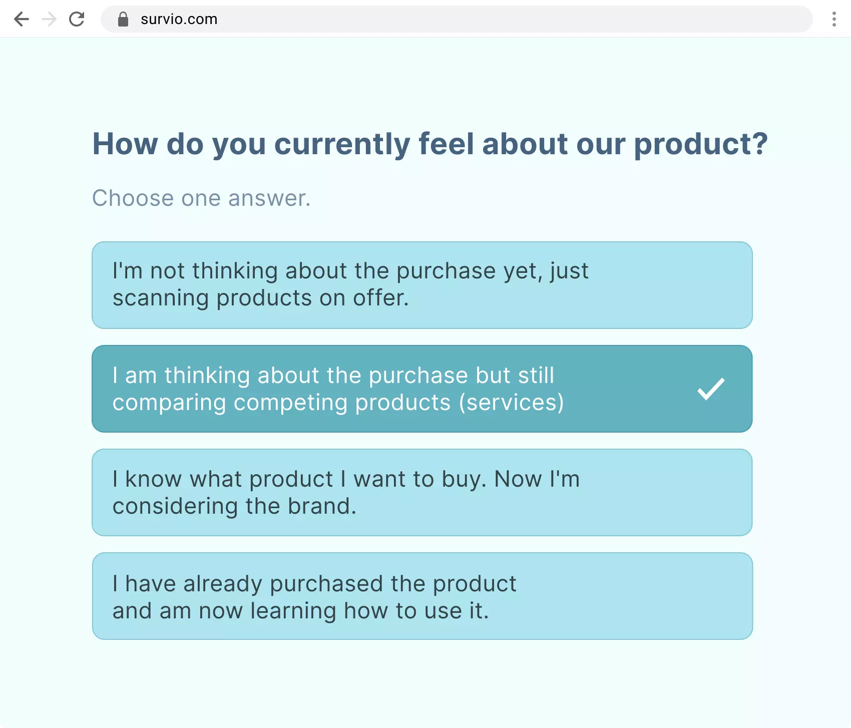 It is crucial to measure purchase intention regularly. You can check the purchase intent only once and keep track of your customers' purchases for the next period. But you'll never get as much out of the data as you can when you compare it over time.