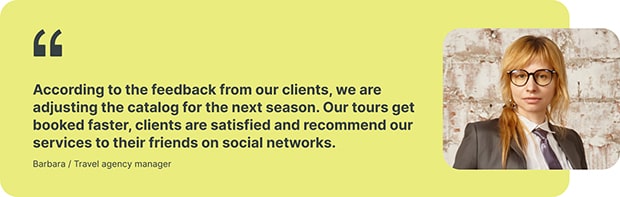 Travelers' wishes are changing. The situation in the world is also changing. Collect data from your clients on a regular basis so that you can adapt to their needs at all times. Your clients will be happy to come back to you.