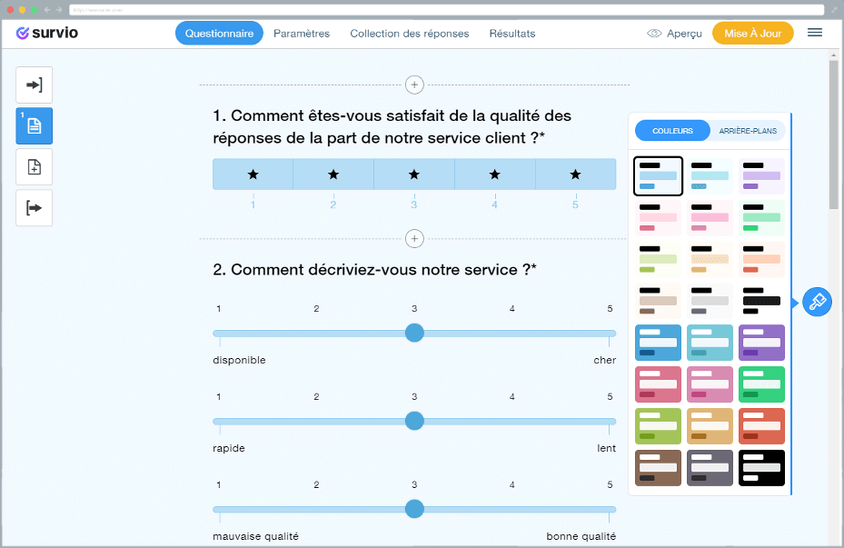 - Nouveau design des sondages vous permet de paramétrer les couleurs et les nouveaux arrière-plans ou bien même mettre votre propre image au fond du questionnaire.