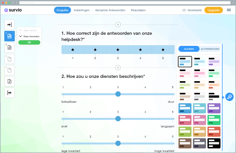 - Nieuw enquête design met de mogelijkheid om de leuke achtergronden en kleurenthema’s zelf te editen en ook eigen sjablonen design te gebruiken