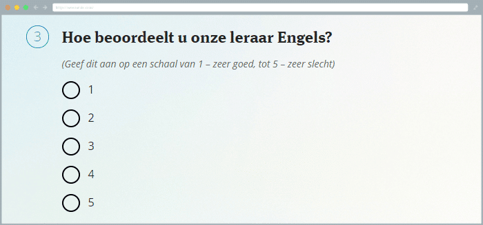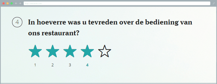 Als antwoord (afbeelding van waardeschaal) dienen bijv. sterretjes, die u aan uw behoeften kunt aanpassen. Bij Survio hebt u de schaal van drie tot tien sterretjes ter beschikking. Een ideaal aantal symbolen (waarden) stelt de vijfpunt-Likert-schaal voor.