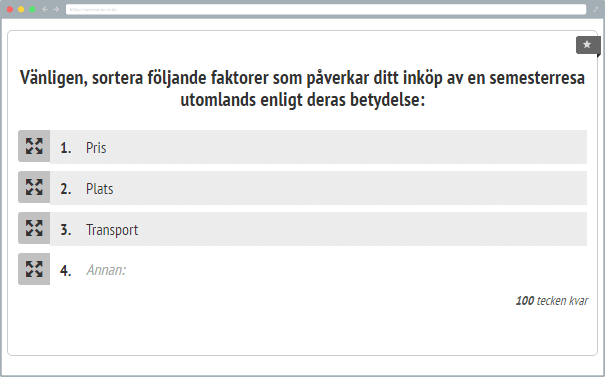 Denna typ av fråga används för att sortera svar i respondents prioritetsordning. För det mesta sorteras dem genom att tilldela nummer eller flytta på enskilda svaralternativ.
